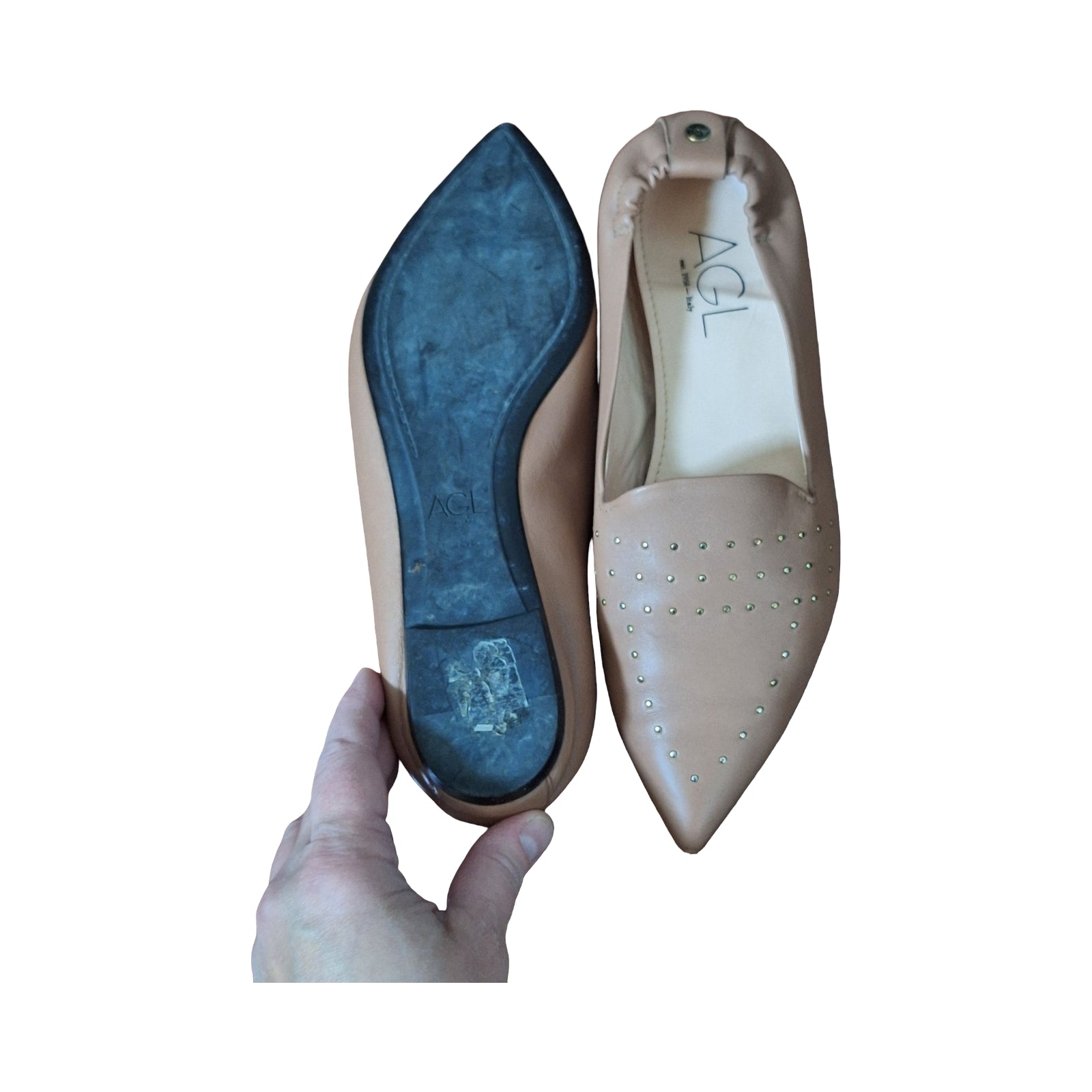 AGL Attilio Giusti Leombruni Soft Leather Studded Pointed Toe Slip on Flats EU 38, US 7.5. Pre-loved in good condition overall. These are a nude/almost light pink color.