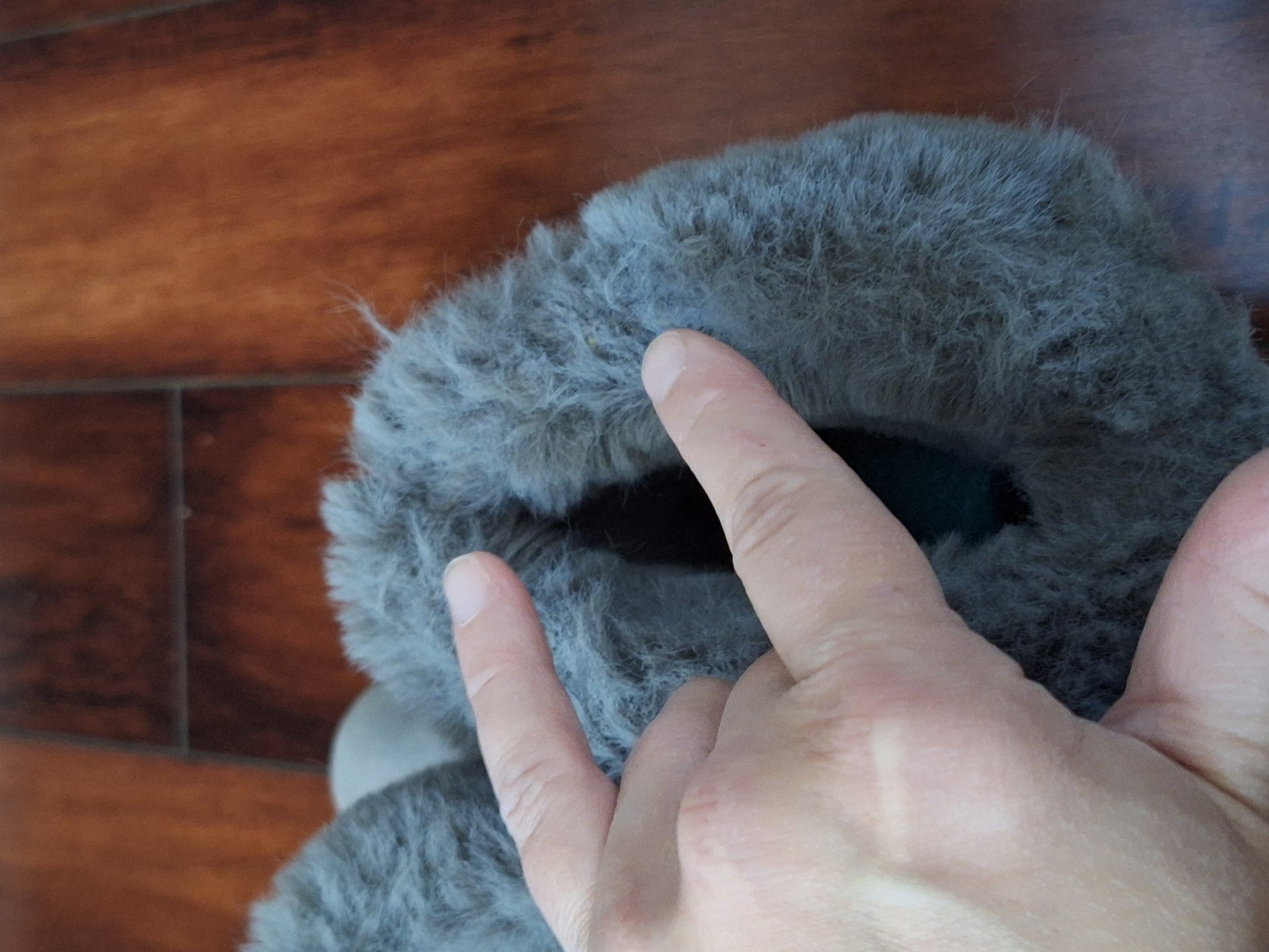 Pre-loved, with little wear. There is a call out on the right back heel as seen in photo and 2 areas where the fur looks flat (also pictured) Not noticeable unless you're looking for it.