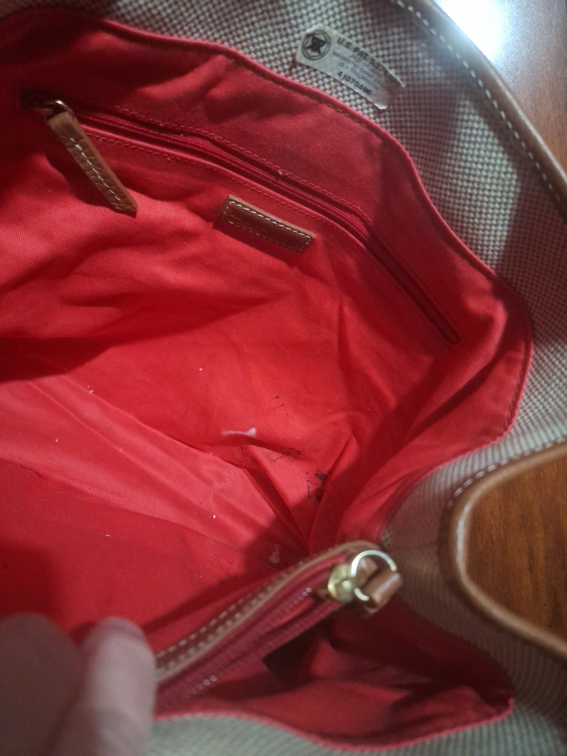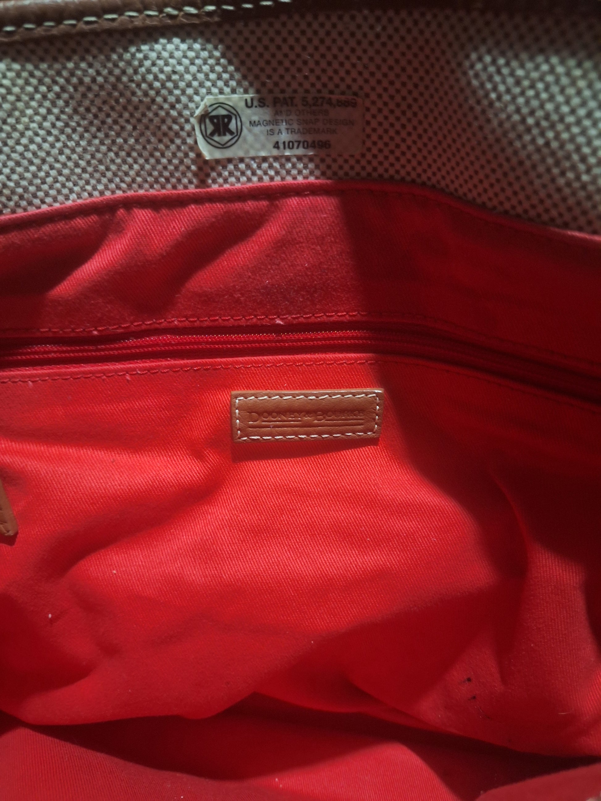 Dooney & Bourke Donegal Tote Leather Trimmed Ivory Brown Shoulder Bag Purse, pre-loved. Has a few pen marks on the inside as seen in photos. There is also a couple faint spots on the outside as well. In good condition overall. Please see photos for wear.
