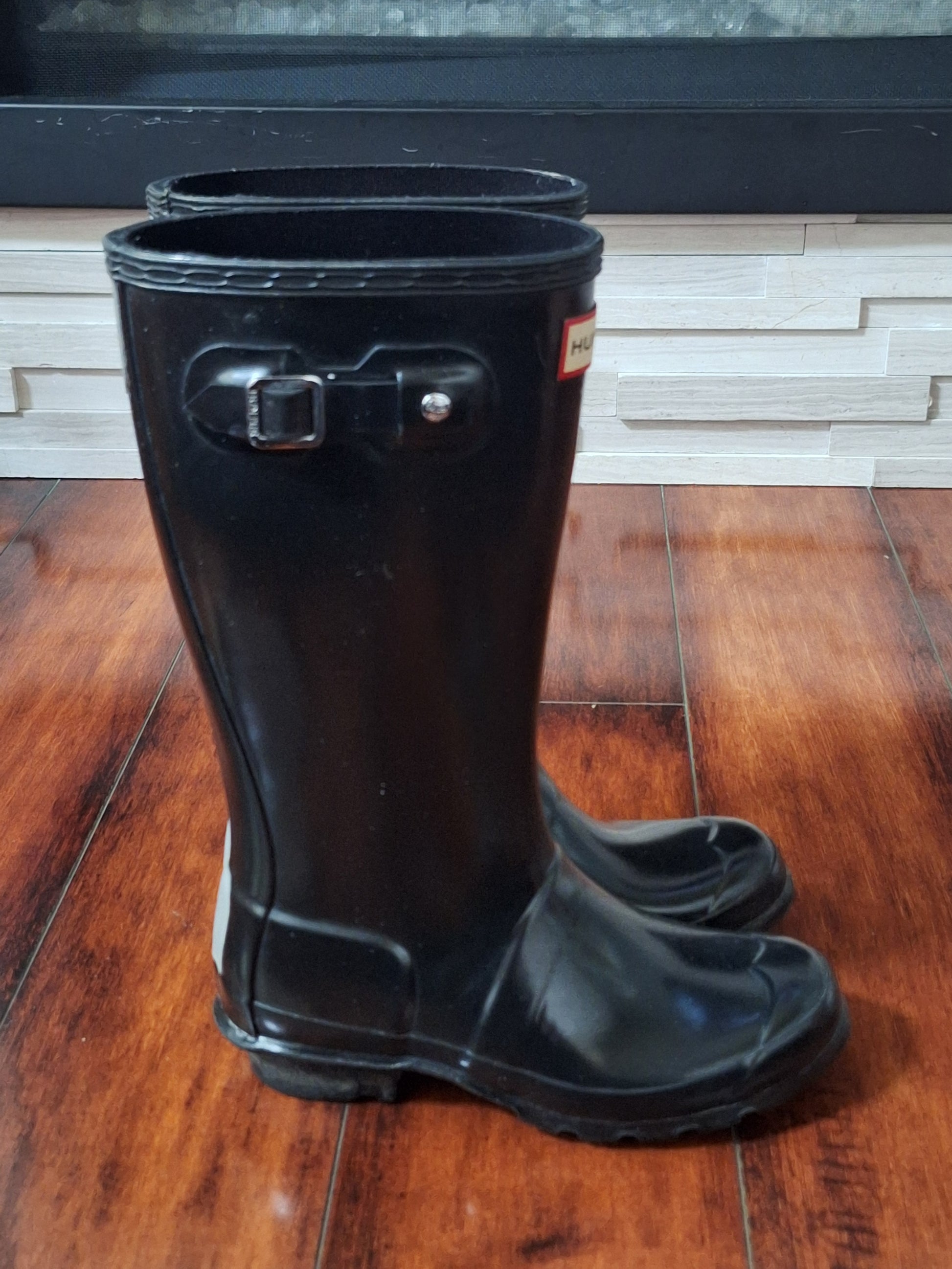 Hunter Kids Black Glossy Original Tall Rain Boots Wellies US Girls 2 / Boys 1, pre-loved. In good condition overall. Please see photos for wear.
