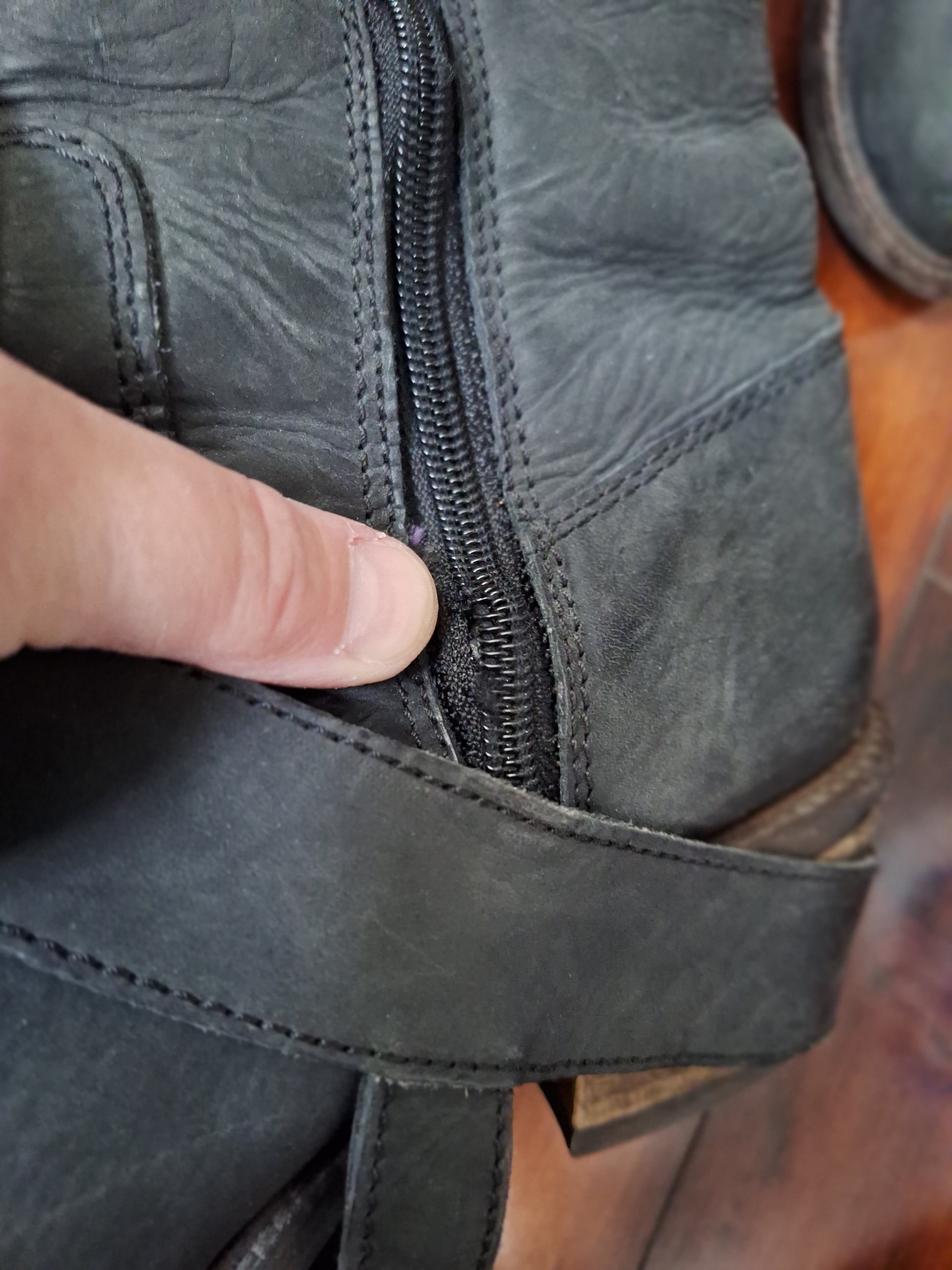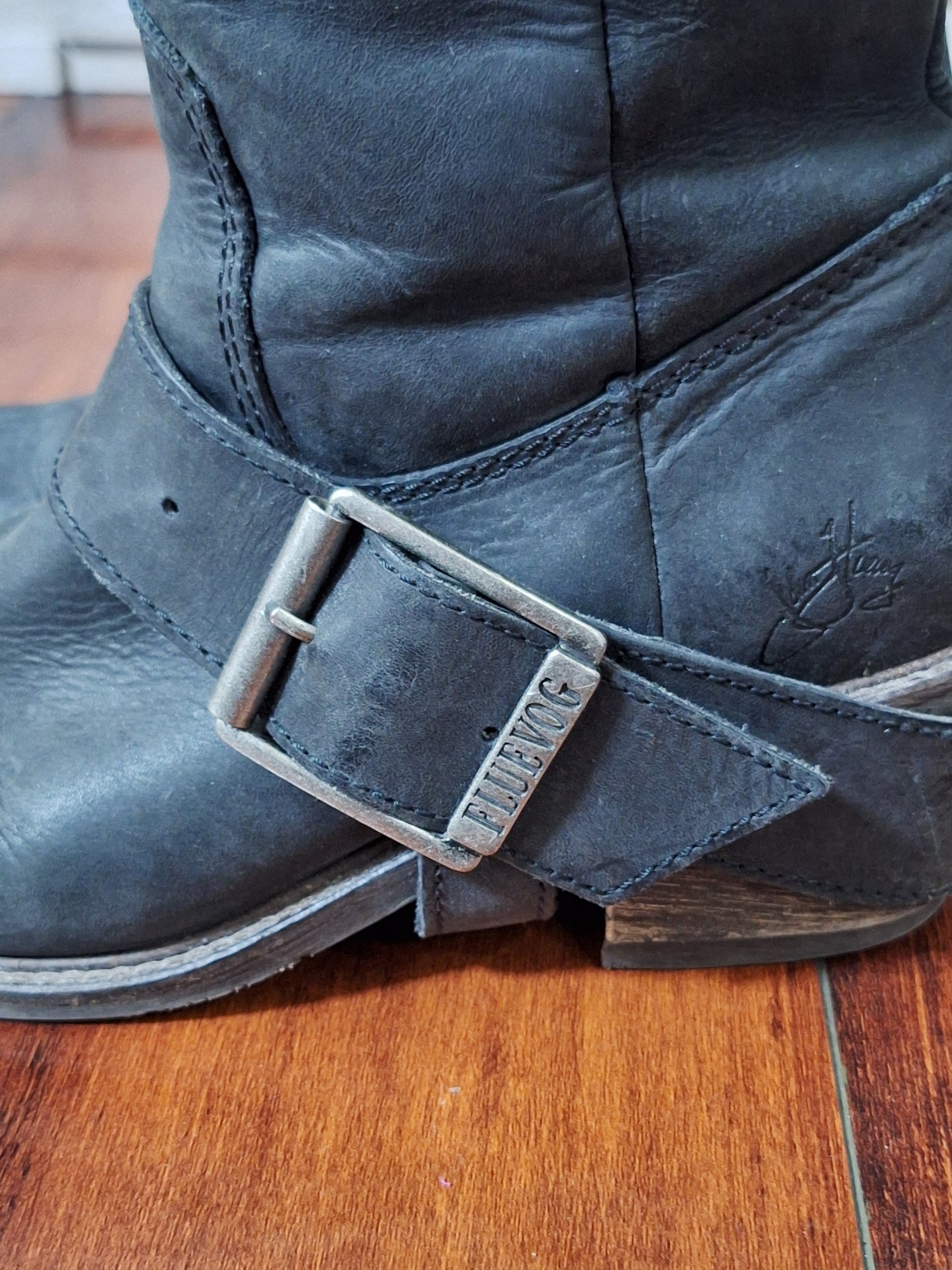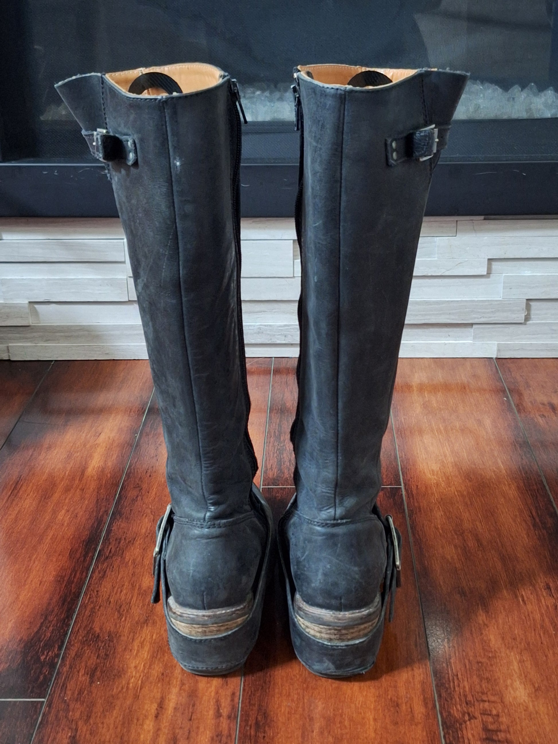 John Fluevog Adriana Luna Tall Buckled Harness Boot Black Leather 854025 size 7, pre-loved. In good condition overall, there is some pulling away by the right zipper (boots zip up just fine) please see photos for wear.