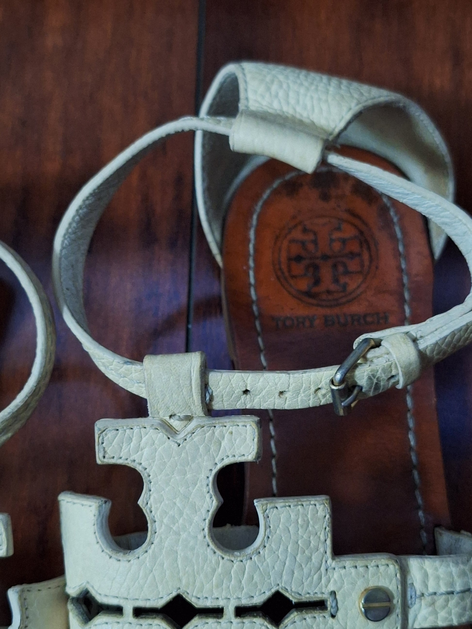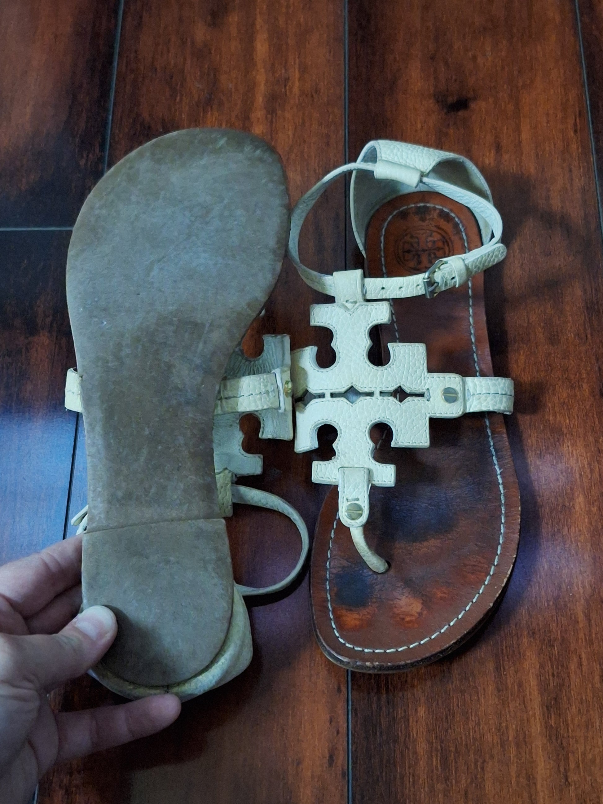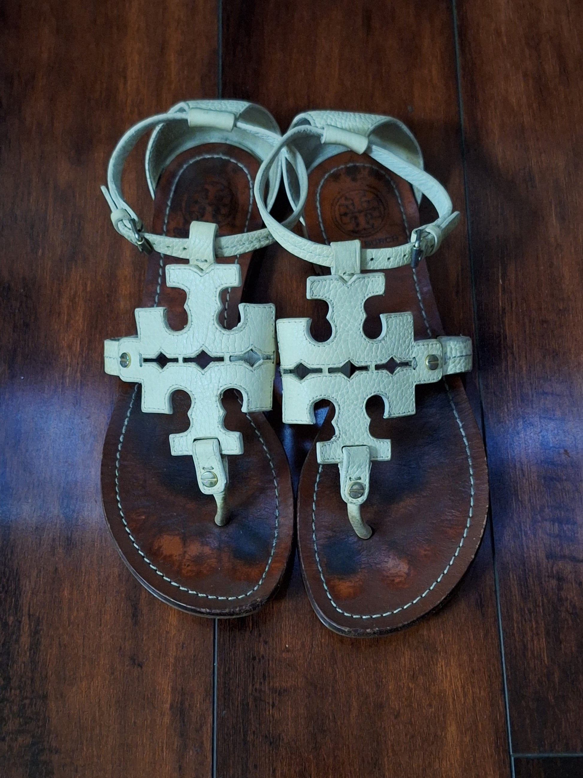 Tory Burch Phoebe Flat Thong Sandals Ivory Tumbled Leather, Size 10.5M, pre-loved. Wear on the bottom of heels, not noticeable when on. Please see photos for wear.